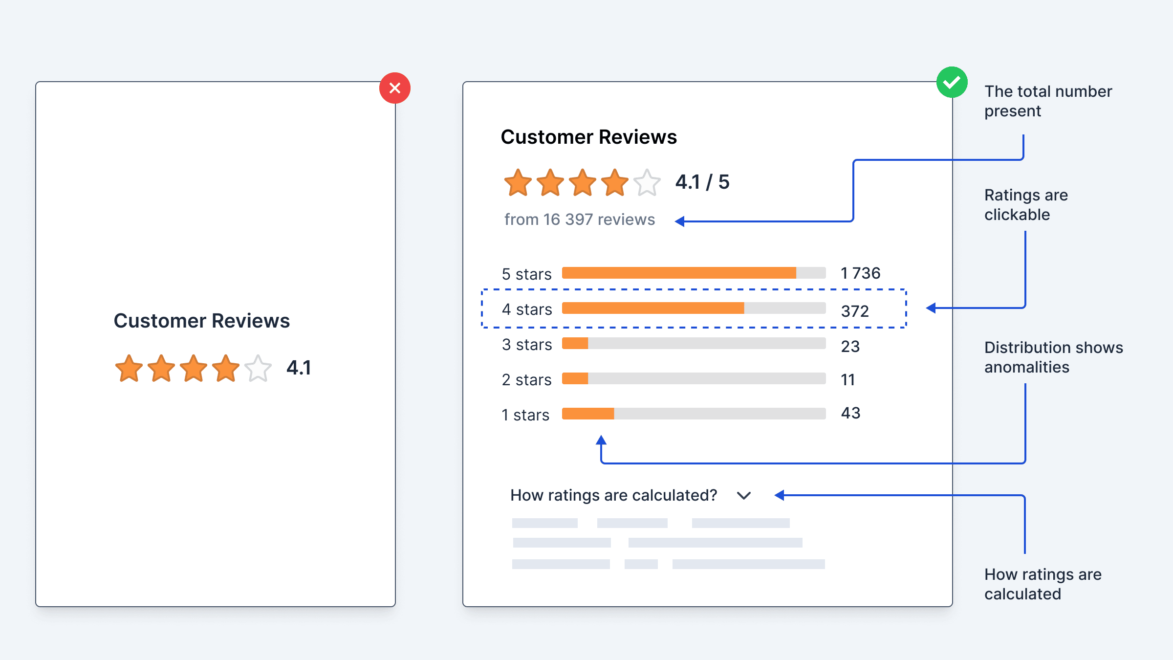 Take a look at the picture on the left. Can you consider this an objective rating? I guess not, since we don't know much about the number of reviews, how many are really bad (1 star), and how many are really good (5 stars). How is the rating calculated, after all? Does it consider only the latest reviews or all historical data? Many questions. No answers. When displaying ratings, there are several factors to consider:
